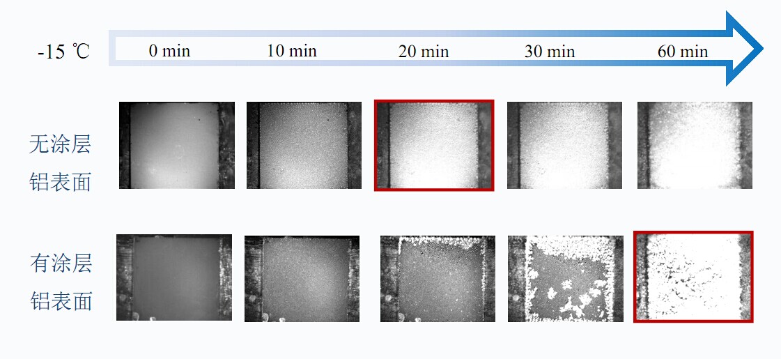 冰霜的形成延缓:减小了冷凝水滴与冷表面的传热面积,抑制冷凝水转变成冰霜;同时,由于冷凝水不易积累,进一步抑制了冰霜的生长,大大延长除霜周期。