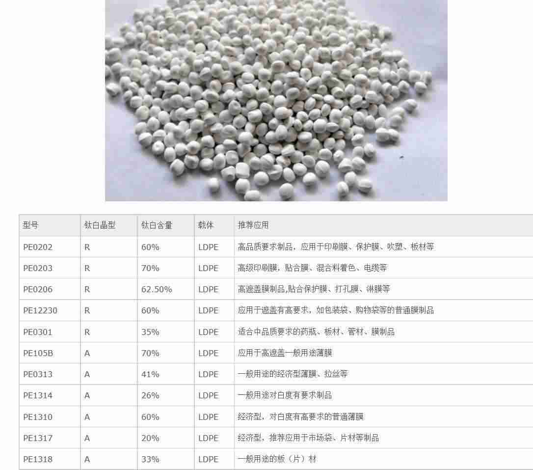 白色母是以优质进口金红石型钛白粉为主要原料,经与载体树脂和分散剂,润滑剂等多种助剂混合,并经高性能双螺杆挤出机充分混炼,挤出造粒而成,具有在基体树脂中分散性好,白度高,加工性能好等优点.此款白色母钛白粉含量在15%左右,具有耐晒,抗老化的特点,适合用于抽粒,注塑等生产工艺。
